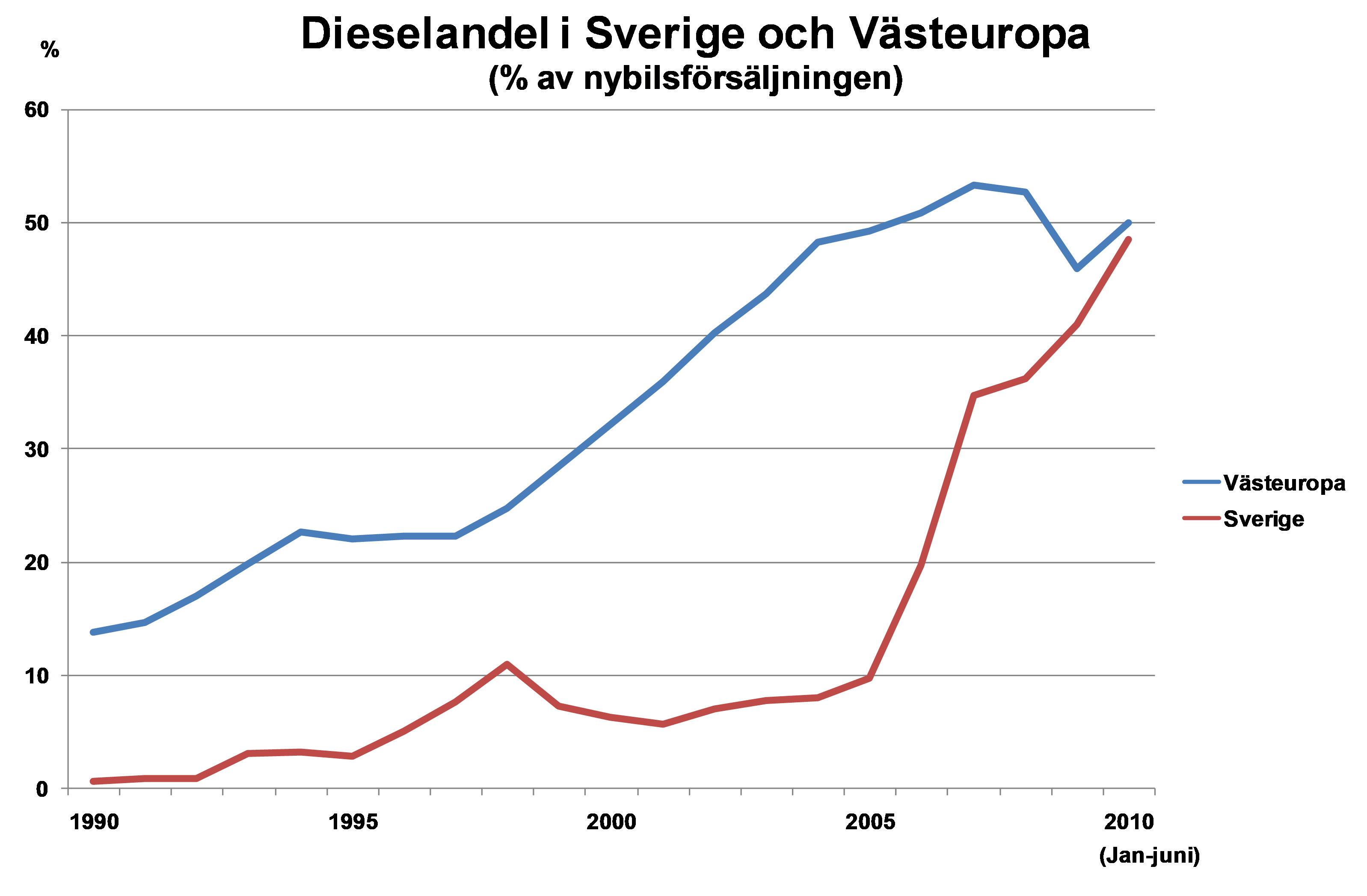 Andelen dieselbilar av nybilsregistreringarna har ökat kraftigt i Sverige under senare år och vi har nu fått en europaanpassning av den svenska bilmarknaden när det gäller dieselandelen, berättar BIL Swedens årsbok Bilismen i Sverige 2010. Under de första åtta månaderna 2010 var varannan ny bil en diesel, dvs samma nivå som genomsnittet för Västeuropa. För bara fem år sedan var dieselandelen i Sverige endast cirka 10 procent.