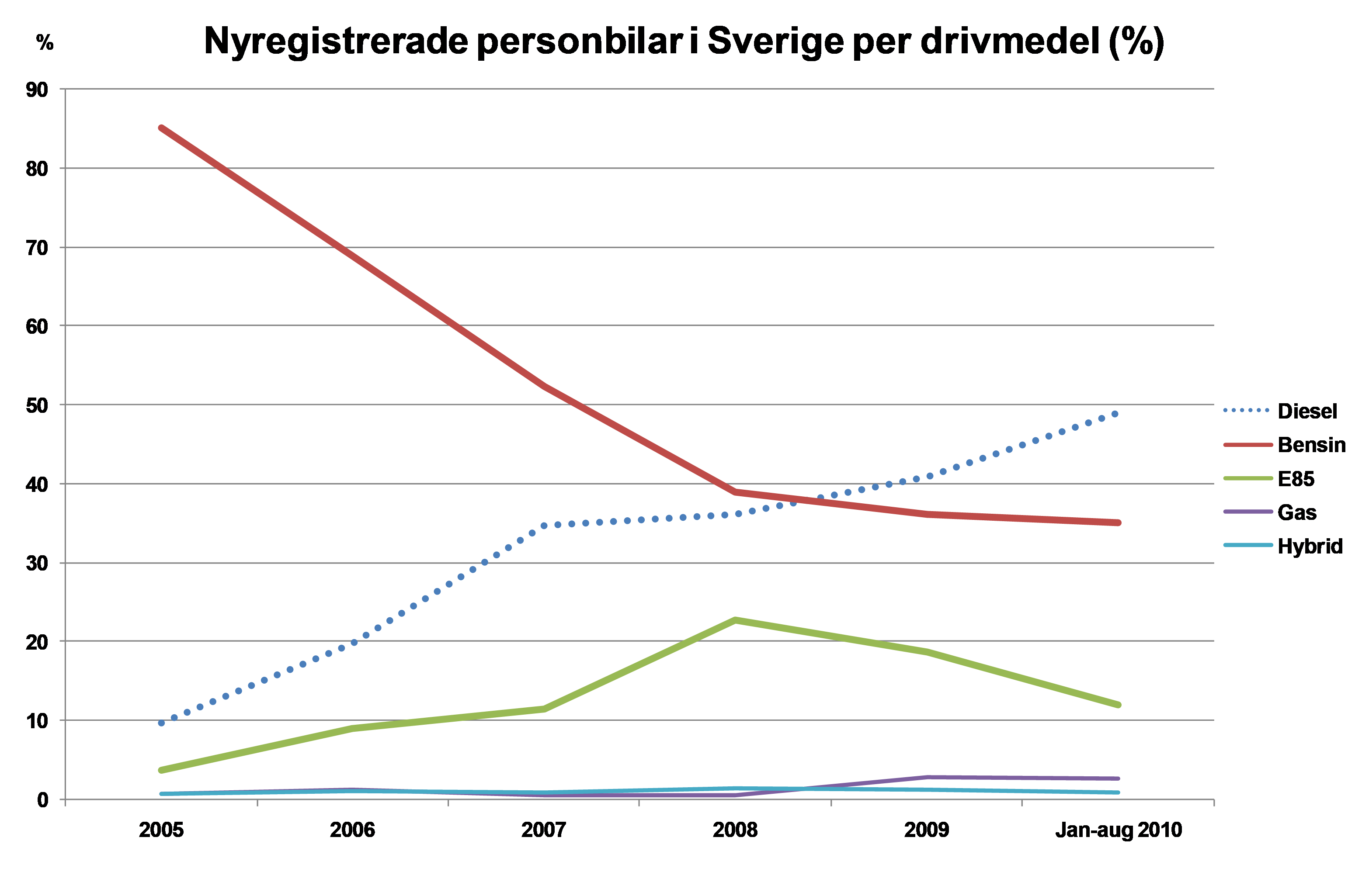 Det har varit en dramatisk omställning på den svenska nybilsmarknaden under de senaste fem åren. Andelen dieselbilar har ökat kraftigt och vi har nu nått den genomsnittliga europanivån för dieselandelen, visar BIL Swedens årsbok Bilismen i Sverige 2010. Samtidigt har andelen bensindrivna bilar minskat kraftigt. För fem år sedan var 85 procent av alla nya bilar bensindrivna och 10 procent dieseldrivna. Idag (jan-aug 2010) är 49 procent dieslar och 35 procent bensinare. Andelen etanoldrivna bilar ökade från 4 procent 2005 till 23 procent 2008, men har därefter sjunkit och är 12 procent idag. Gasbilsandelen har ökat från en halv procent 2005 till närmare 3 procent idag.