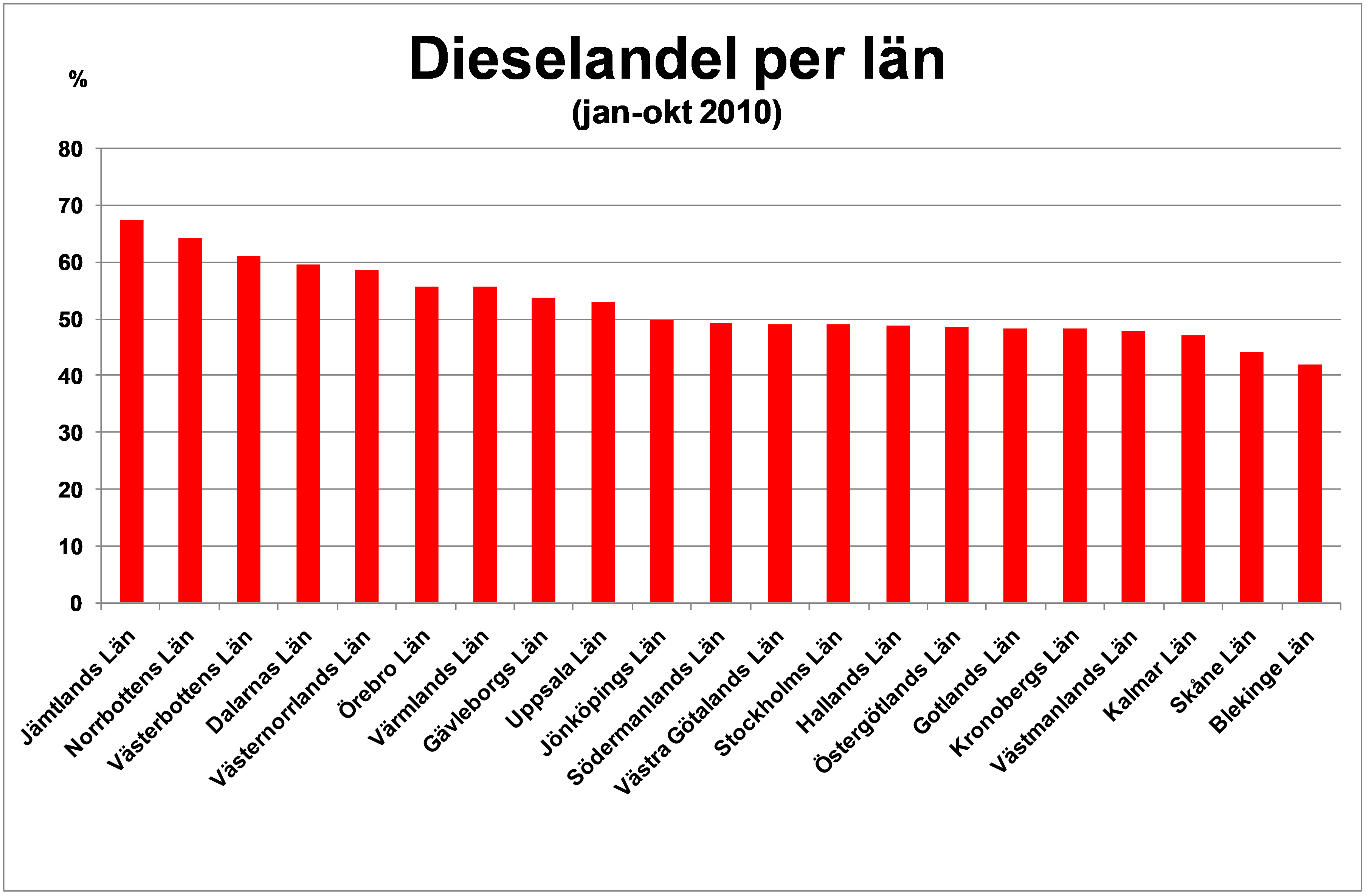 Den högsta dieselandelen under jan-okt hade Jämtlands län med 67,4% dieslar av de totala nyregistreringarna i länet. Den näst högsta dieselandelen hade Norrbottens län med 64,4%.Riksgenomsnittet för dieselandelen var 53,8% i oktober i år jämfört med 44,1% oktober förra året. Jan-okt i år var dieselandelen 49,8%, vilket kan jämföras med samma period förra året då andelen var 40,1%.