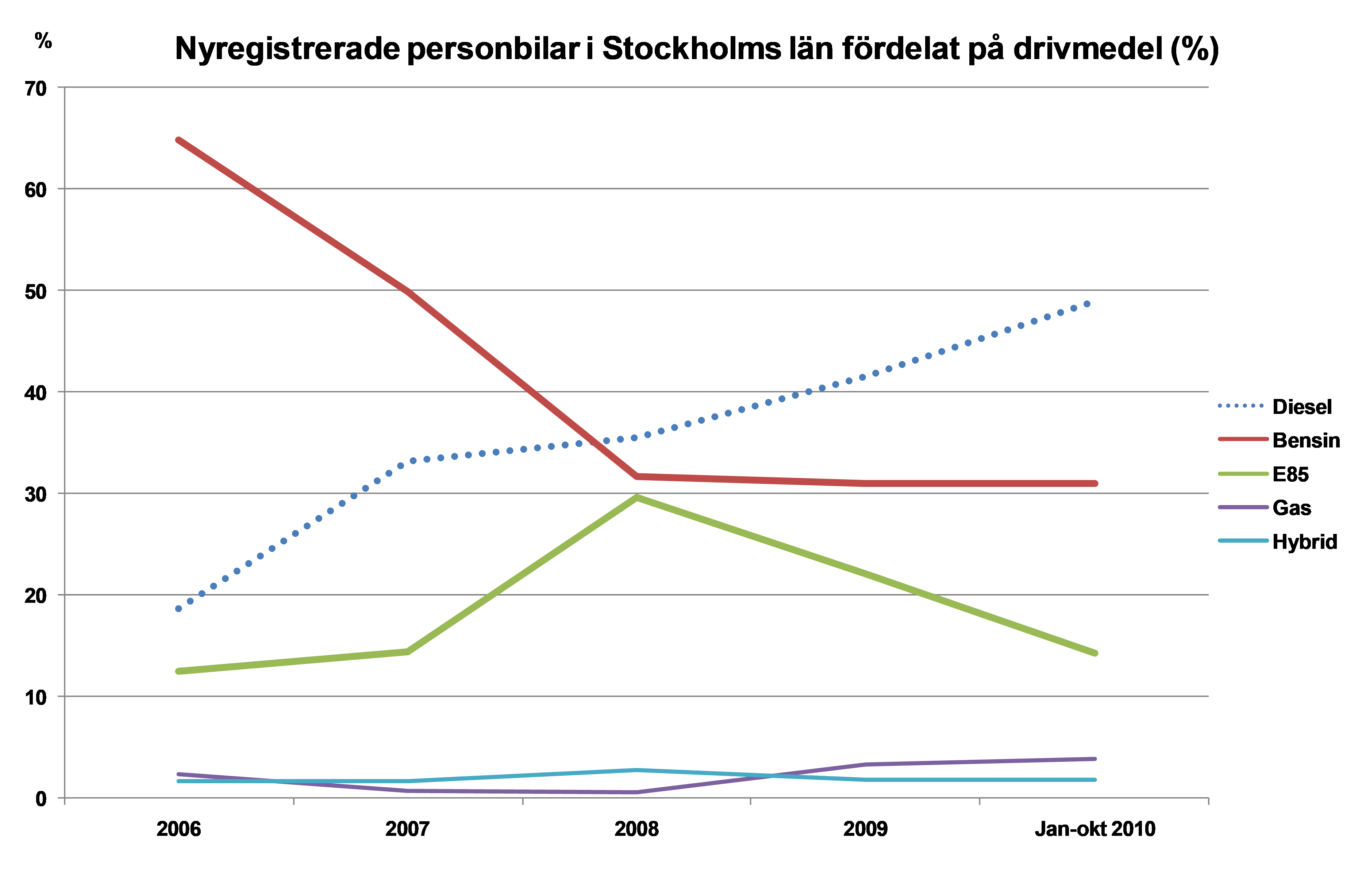 BIL Swedens läns- och kommunfördelade statistik för januari-oktober visar att varannan nyregistrerad bil i Stockholms län är en dieselbil jämfört med bara var femte för fyra år sedan. Två av tre nyregistrerade bilar var bensindrivna för fyra år sedan jämfört knappt en av tre idag.