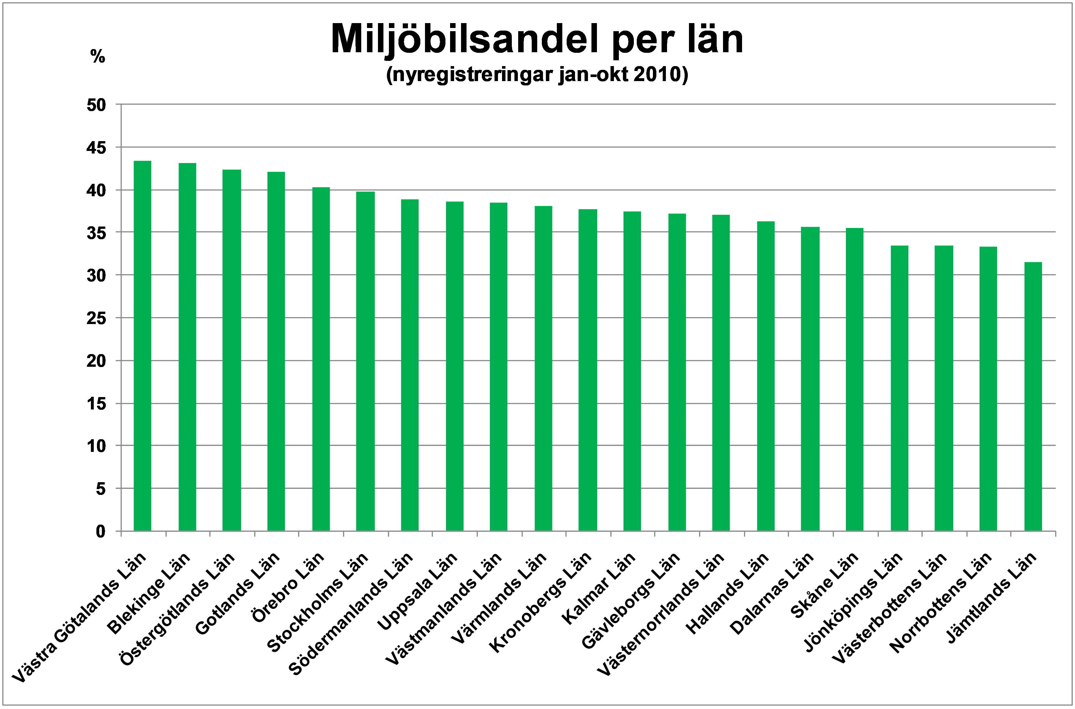 Västra Götalands län hade den högsta miljöbilsandelen i landet jan-okt i år då 43,4% av alla nyregistreringar i länet var miljöbilar. På andra plats kom Blekinge län med 43,1% miljöbilar. Riksgenomsnittet för miljöbilsandelen var 41,0% i oktober i år jämfört med 35,9% oktober förra året. Jan-okt i år var miljöbilsandelen 39,0%, vilket kan jämföras med samma period förra året då andelen var 38,5%.