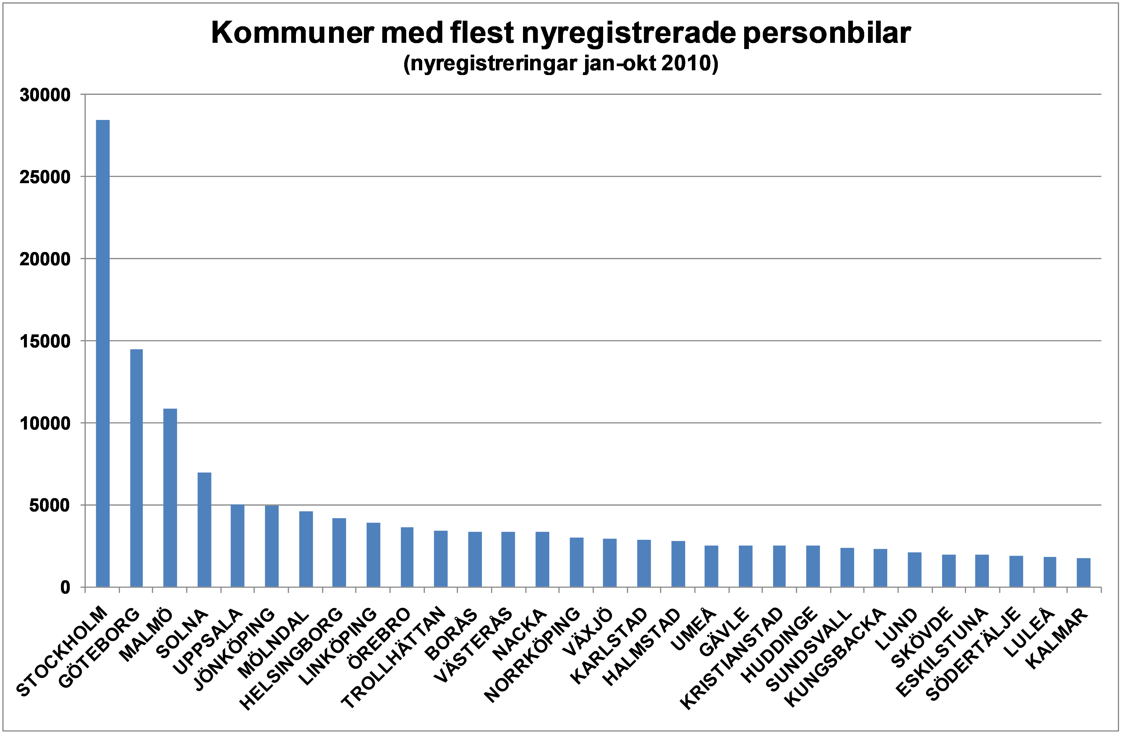 Nyregistreringarna per kommun visar att Stockholm är den kommun i landet som hade flest nyregistreringar hittills år med 28 461 och Åsele kommun hade minsta antalet registreringar med 14 bilar. Att Solna har så många registreringar beror på att flera leasing- och hyrbilsbolag har sitt säte i Solna, vilket innebär att många leasingbilar och hyrbilar registreras i Solna men bilarna används i övriga delar av landet.