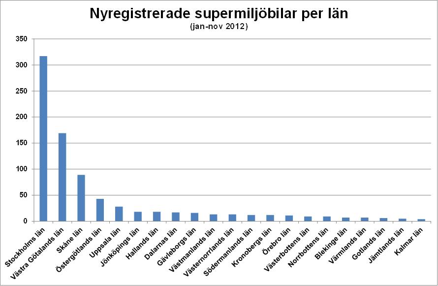 - De flesta nya supermiljöbilar, dvs personbilar med koldioxidutsläpp på högst 50 gram per km, registreras i storstadslänen. Stockholms län svarar för nästan 40 procent av de supermiljöbilar som nyregistrerats hittills i år. Supermiljöbilarnas andel av de totala nybilsregistreringarna är än så länge mycket låg, mindre än en halv procent, säger Bertil Moldén.