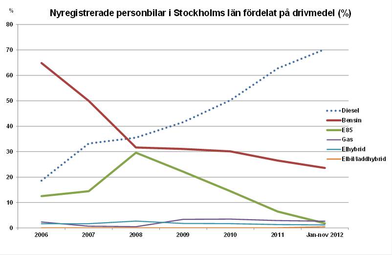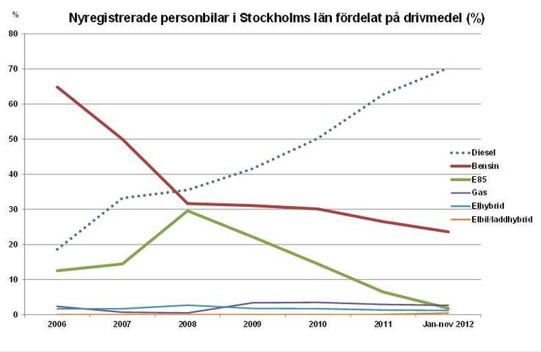 - Omställningen på den svenska nybilsmarknaden mellan olika bränsletyper har varit stor under de senaste åren. Andelen dieselbilar har ökat kraftigt samtidigt som andelen bensinbilar sjunkit. I Stockholms län var 19 procent av nybilsregistreringarna dieselbilar och 65 procent bensinbilar under 2006. Idag är förhållandet det omvända och hittills i år är 70 procent dieslar och 24 procent bensinare. En annan förändring är den kraftigt minskade etanolbilsandelen sedan toppnivån 2008, säger Bertil Moldén, vd för BIL Sweden.