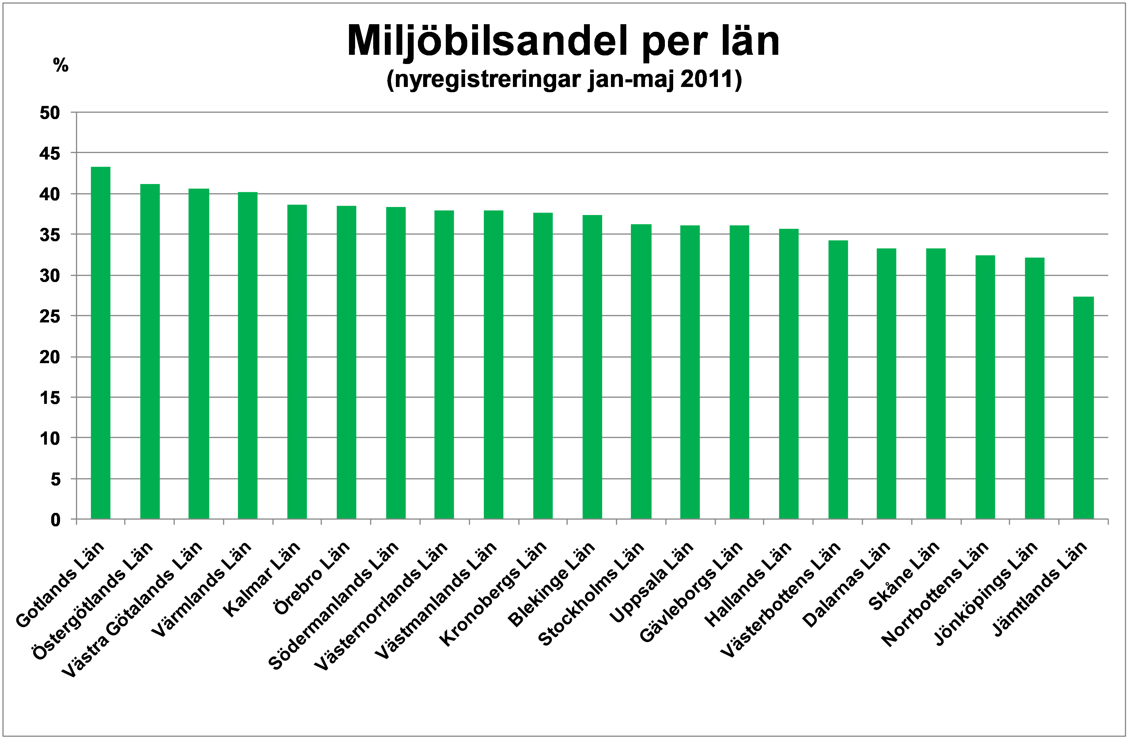 Gotlands län hade den högsta miljöbilsandelen i landet under jan-maj 2011 då 43,3% av alla nyregistreringar i länet var miljöbilar. På andra plats kom Östergötlands län med 41,2% miljöbilar. Riksgenomsnittet för miljöbilsandelen var 36,8% under jan-maj 2011 jämfört med 36,4% under jan-maj 2010.