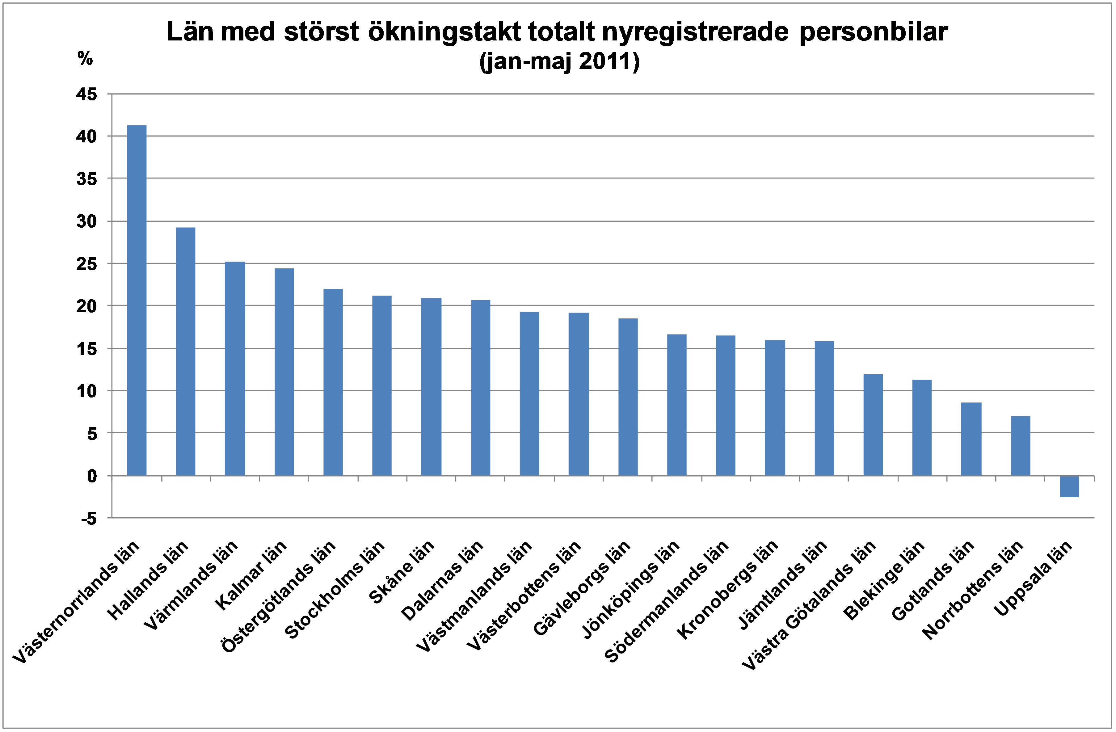 I Stockholms län uppgick det totala antalet nyregistrerade personbilar under jan-maj 2011 till 33 536 vilket är 21,2% fler än under jan-maj 2010. Motsvarande siffror för det näst största länet, Västra Götalands län, var 24 428 registreringar, en uppgång med 11,9%. Det län som hade den största ökningstakten för nyregistreringarna var Västernorrlands län med ett plus på 41,3%, följt av Hallands län med en ökning på 29,2% under jan-maj 2011.