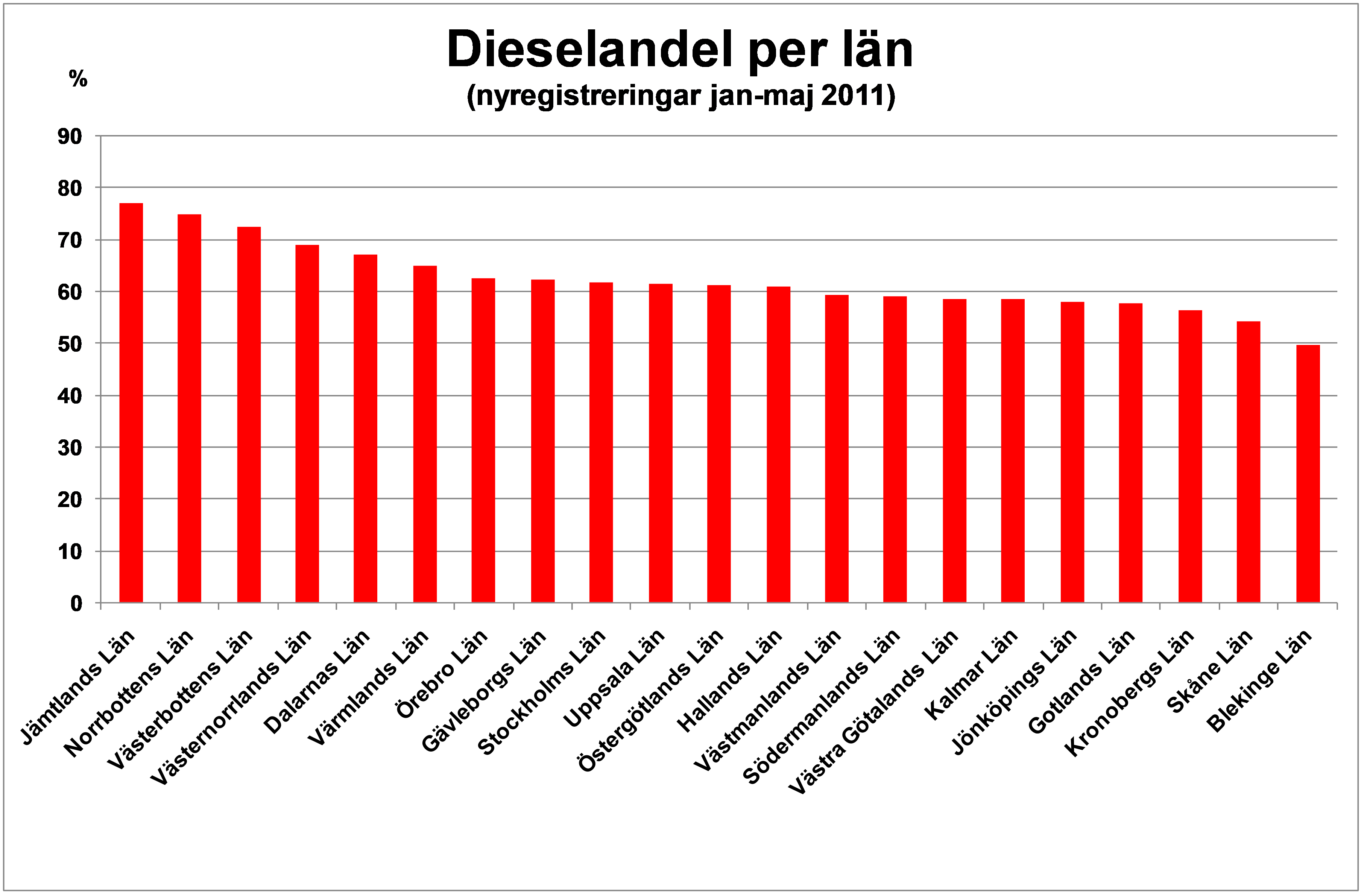 Den högsta dieselandelen under jan-maj 2011 hade Jämtlands län med 77,1% dieslar av de totala nyregistreringarna i länet. Den näst högsta dieselandelen hade Norrbottens län 74,8 %. Riksgenomsnittet för dieselandelen under jan-maj 2011 var 60,3% jämfört med 48,1% under jan-maj 2010.