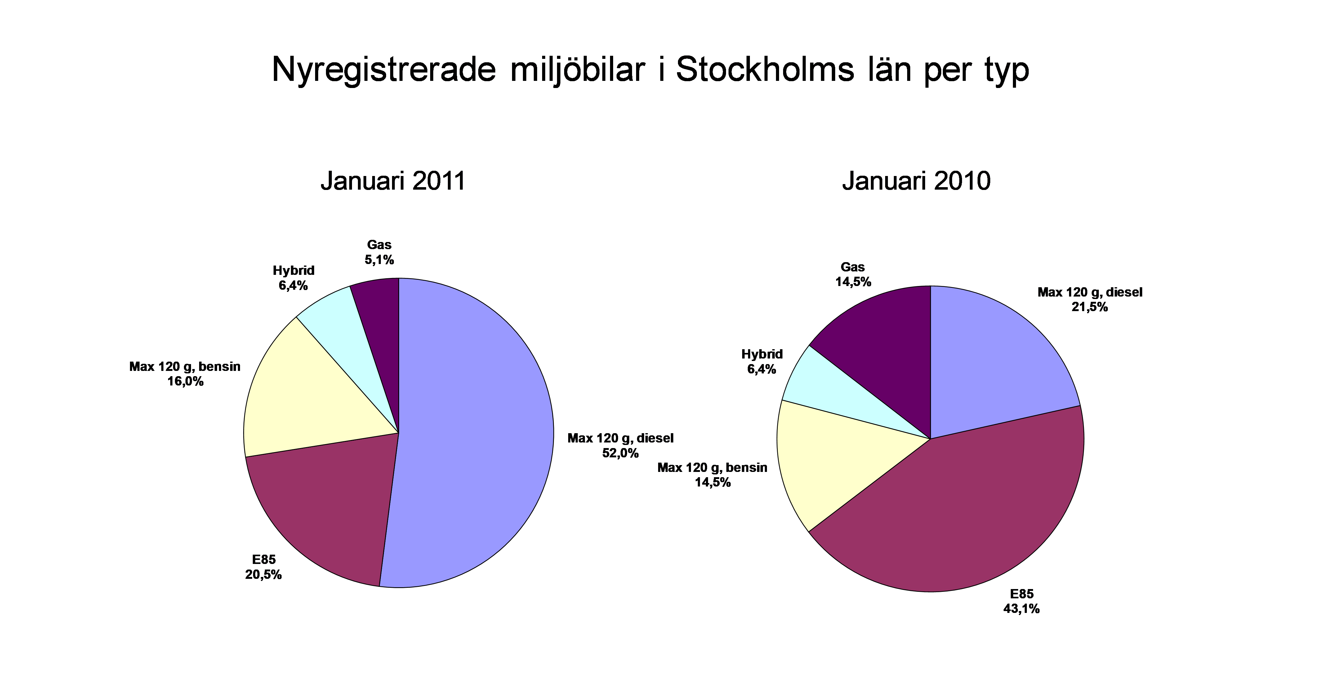 BIL Swedens läns- och kommunfördelade statistik för januari 2011 visar att dieselbilar med koldioxidutsläpp på max 120 g/km dominerar på miljöbilsmarknaden. I Stockholms län var varannan nyregistrerad miljöbil i januari en dieseldriven ”120-grammare”. Samtidigt tappar både etanolbilar och gasbilar marknadsandelar.
