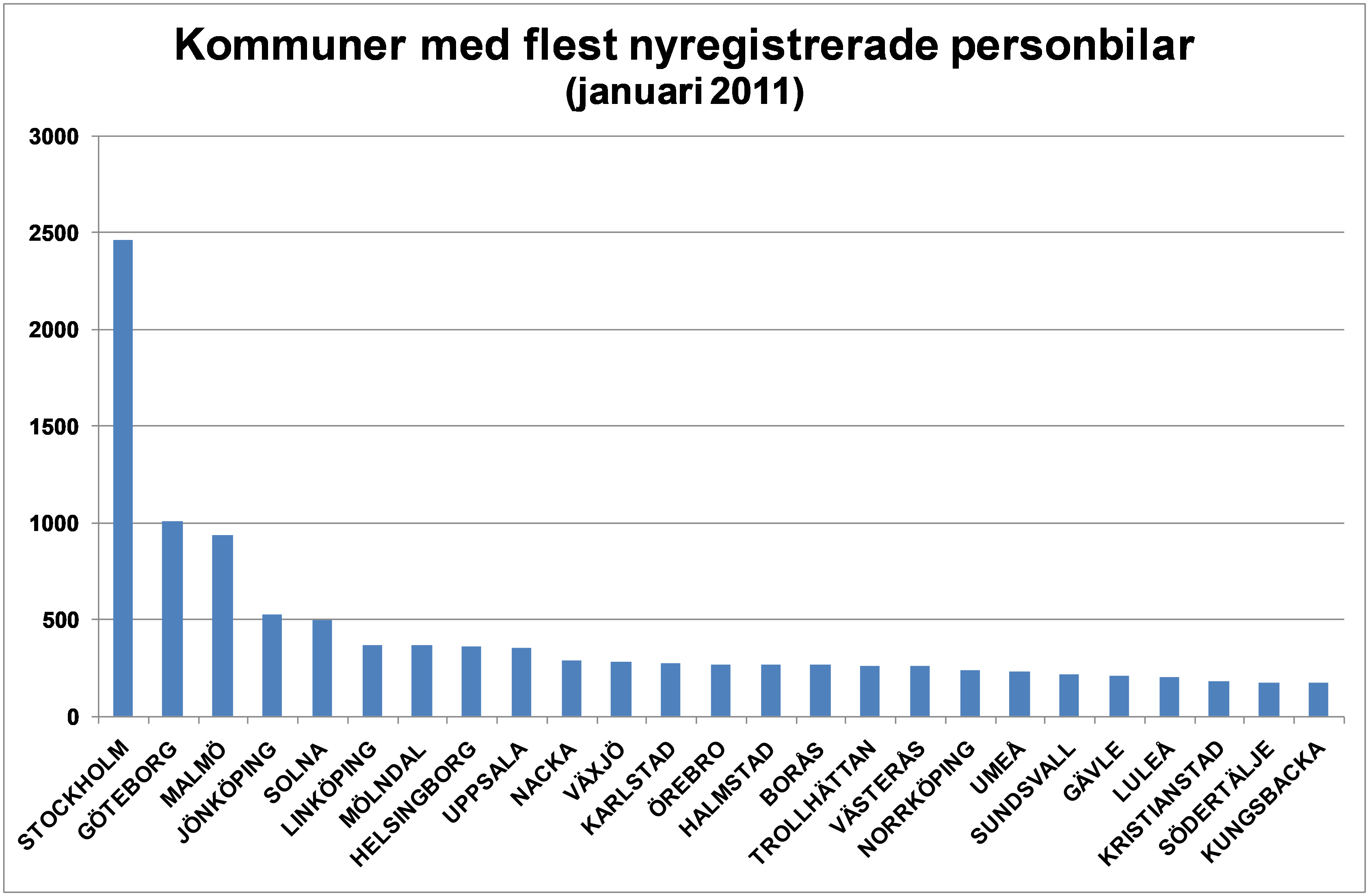 Nyregistreringarna per kommun visar att Stockholm är den kommun i landet som hade flest nyregistreringar under januari 2011 med 2 464 följt av Göteborg med 1 010 registreringar. Att Solna har så många registreringar beror på att flera leasing- och hyrbilsbolag har sitt säte i Solna, vilket innebär att många leasingbilar och hyrbilar registreras i Solna men bilarna används i övriga delar av landet.