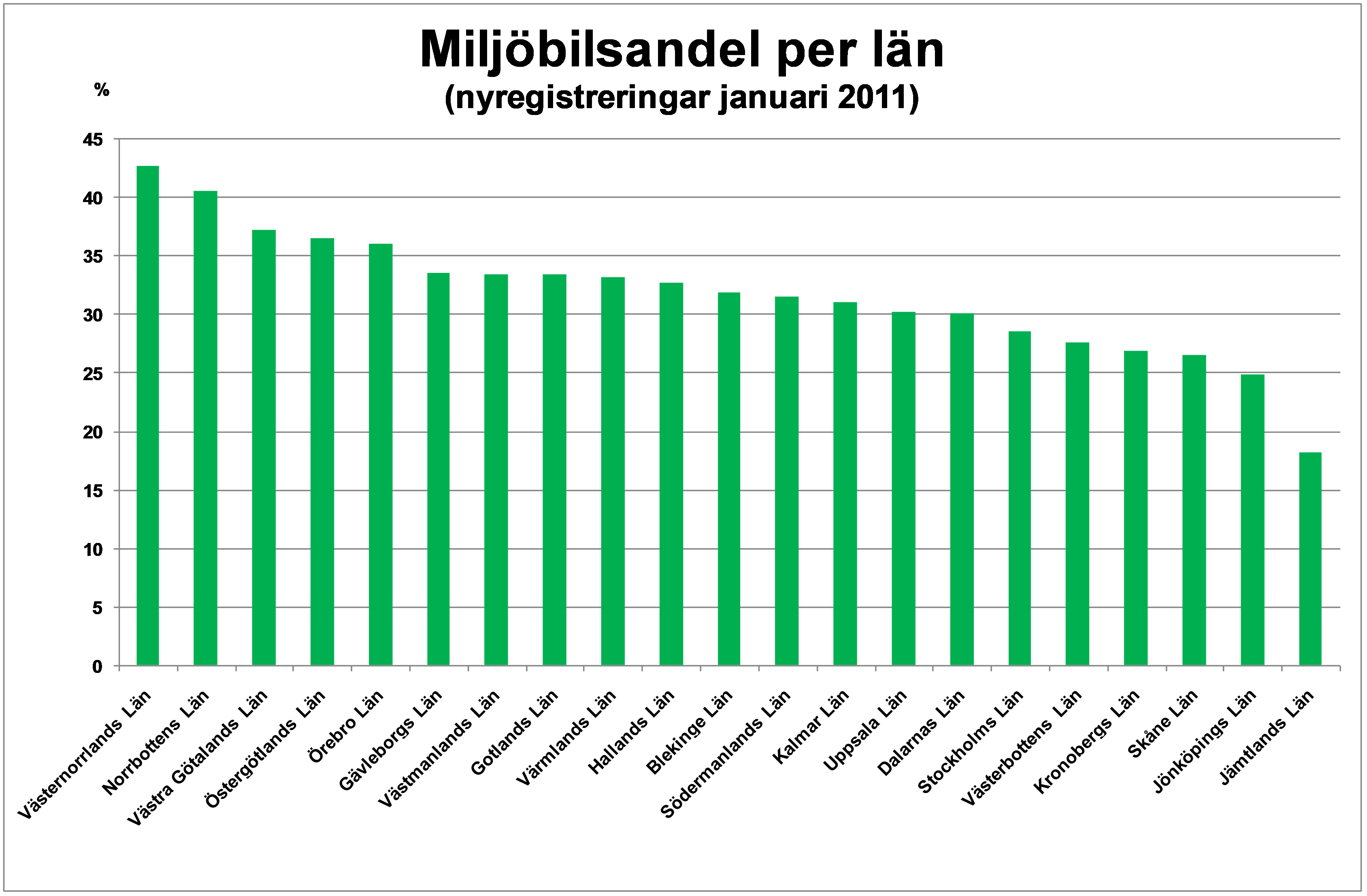 Västernorrlands län hade den högsta miljöbilsandelen i landet under januari 2011 då 42,6% av alla nyregistreringar i länet var miljöbilar. På andra plats kom Norrbottens län med 40,5% miljöbilar. Riksgenomsnittet för miljöbilsandelen var 31,4% under januari 2011 jämfört med 36,2% under januari 2010.