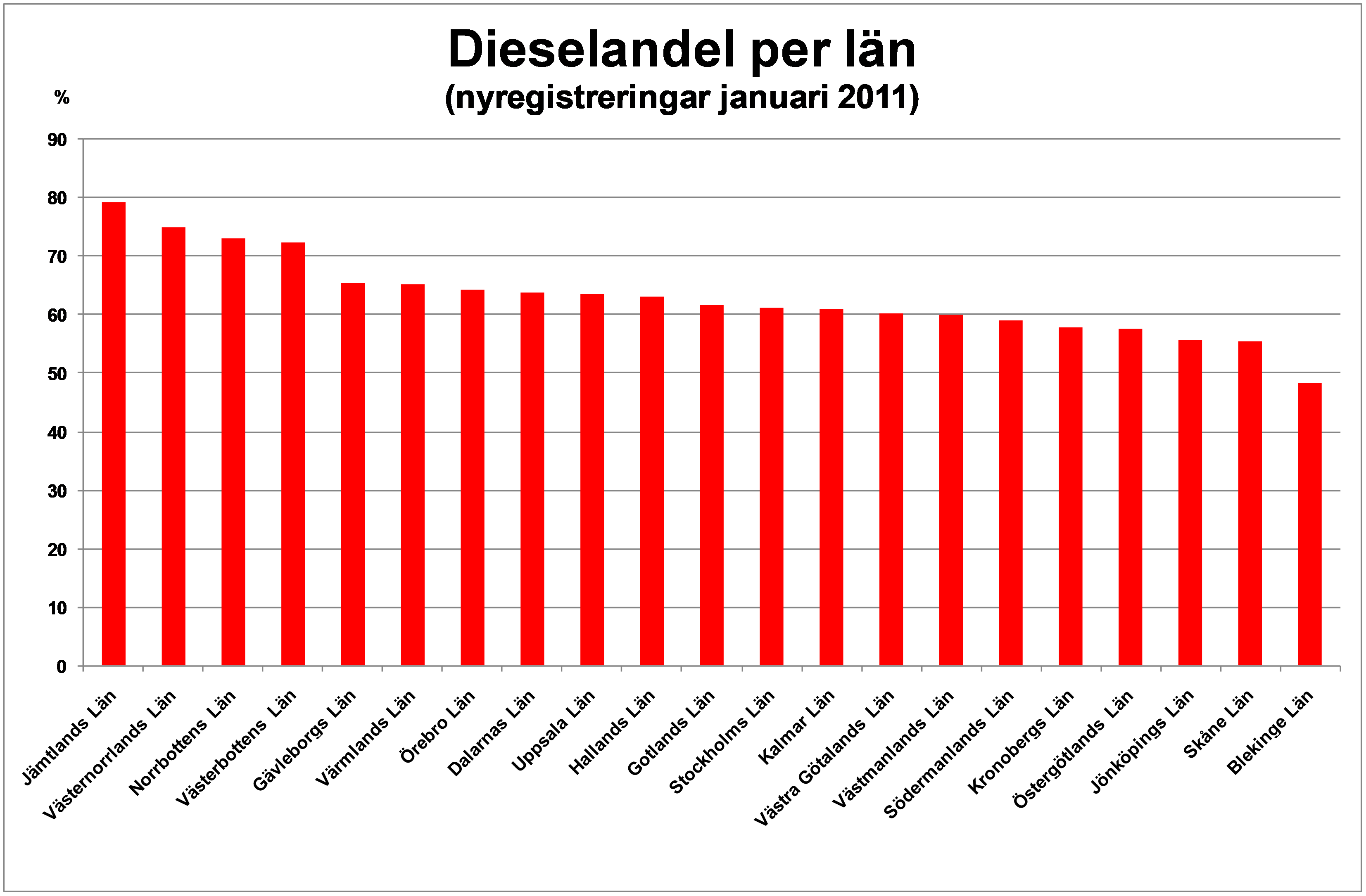 Den högsta dieselandelen under januari 2011 hade Jämtlands län med 79,2% dieslar av de totala nyregistreringarna i länet. Den näst högsta dieselandelen hade Västernorrlands län med 74,9%. Riksgenomsnittet för dieselandelen under januari 2011 var rekordhöga 60,8% jämfört med 44,6% under januari 2010.