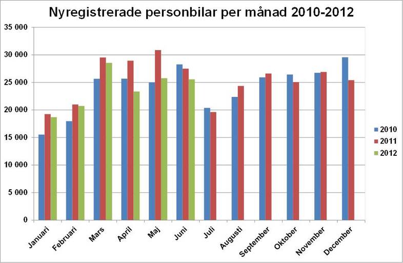 - Personbilsregistreringarna i juni minskade med 7 procent och lätta lastbilar minskade med 10 procent. Registreringarna hittills i år är i linje med vår helårsprognos för 2012 på 270 000 personbilar och 41 000 lätta lastbilar, säger Bertil Moldén, vd för BIL Sweden.