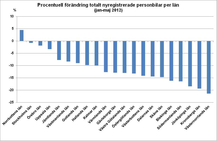 I Stockholms län uppgick det totala antalet nyregistrerade personbilar under jan-maj 2012 till 33 283 vilket är 0,8 % färre än under jan-maj 2011. Motsvarande siffror för det näst största länet, Västra Götalands län, var 21 255 registreringar, en nedgång med 13,0 %. Det län som hade den största ökningstakten för nyregistreringarna var Norrbottens län med ett plus på 4,5 %.