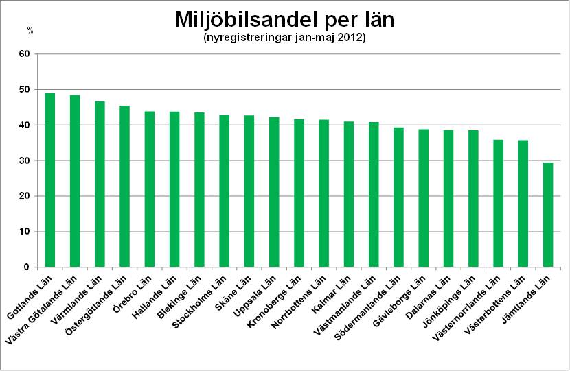 Gotlands län hade den högsta miljöbilsandelen i landet under jan-maj 2012 då 48,9% av alla nyregistreringar i länet var miljöbilar. På andra plats kom Västra Götalands län med 48,5% miljöbilar. Riksgenomsnittet för miljöbilsandelen under jan-maj 2012 var 43,2% jämfört med 36,8% under jan-maj 2011.