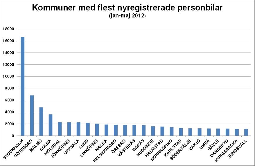 Nyregistreringarna per kommun visar att Stockholm är den kommun i landet som hade flest nyregistreringar under jan-maj 2012 med 16 632 följt av Göteborg med 6 798 registreringar. De höga registreringarna i Stockholm beror bl.a. annat på att många stora börsbolag har sitt säte i Stockholm och att dessa bilar registreras i Stockholm även om de används i övriga delar av landet. Att Solna har så många registreringar beror på att flera leasing- och hyrbilsbolag har sitt säte i Solna, vilket innebär att många leasingbilar och hyrbilar registreras i Solna men bilarna används i övriga delar av landet.