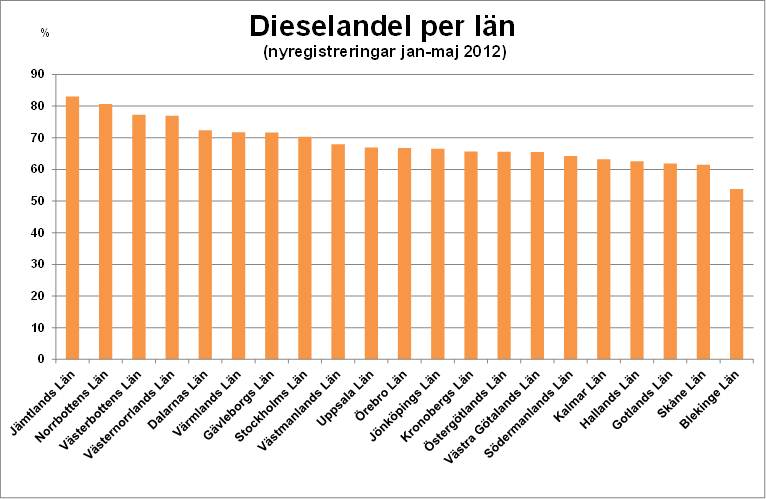 Den högsta dieselandelen under jan-maj 2012 hade Jämtlands län med 83,1% dieslar av de totala nyregistreringarna i länet. Den näst högsta dieselandelen hade Norrbottens län med 80.6 %. Riksgenomsnittet för dieselandelen under jan-maj 2012 var 67,5% jämfört med 60,3% under jan-maj 2011.