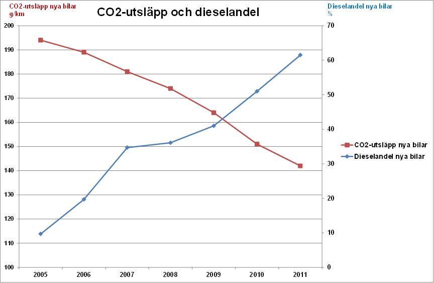 - Den ökade andelen dieselbilar är en viktig förklaring till att koldioxidutsläppen från nya bilar har sjunkit i rekordfart i Sverige. En dieselbil är 20 procent koldioxidsnålare och 30 procent bränslesnålare och energieffektivare än motsvarande bensinbil, säger Bertil Moldén.