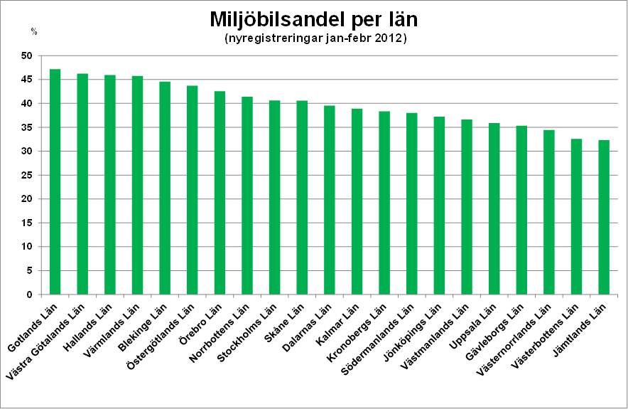 Gotlands län hade den högsta miljöbilsandelen i landet under jan-febr 2012 då 47,2% av alla nyregistreringar i länet var miljöbilar. På andra plats kom Västra Götalands län med 46,2% miljöbilar. Riksgenomsnittet för miljöbilsandelen under jan-febr 2012 var 41,2% jämfört med 33,5% under jan-febr 2011.