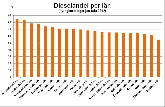 Den högsta dieselandelen under jan-febr 2012 hade Norrbottens län med 84,5% dieslar av de totala nyregistreringarna i länet. Den näst högsta dieselandelen hade Jämtlands län med 84,1%. Riksgenomsnittet för dieselandelen under jan-febr 2012 var 68,4% jämfört med 61,4% under jan-febr 2011.
