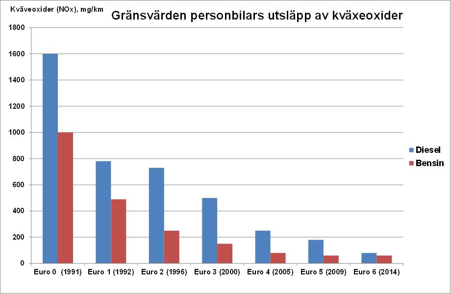 - Nya moderna dieselbilar har ca 90 procent lägre utsläpp av kväveoxider jämfört med dieselbilar från början på 90-talet och 64 procent lägre utsläpp än dieselbilar från början av 2000-talet. Dieselbilar har högre kväveoxidutsläpp än bensinbilar, men det handlar om mycket låga utsläpp både för nya bensinbilar och dieselbilar. I och med de kommande Euro 6 reglerna skärps kraven för kväveoxider från dieselmotorer ytterligare och kommer nästan att vara nere på bensinbilarnas nivå, fortsätter Bertil Moldén.