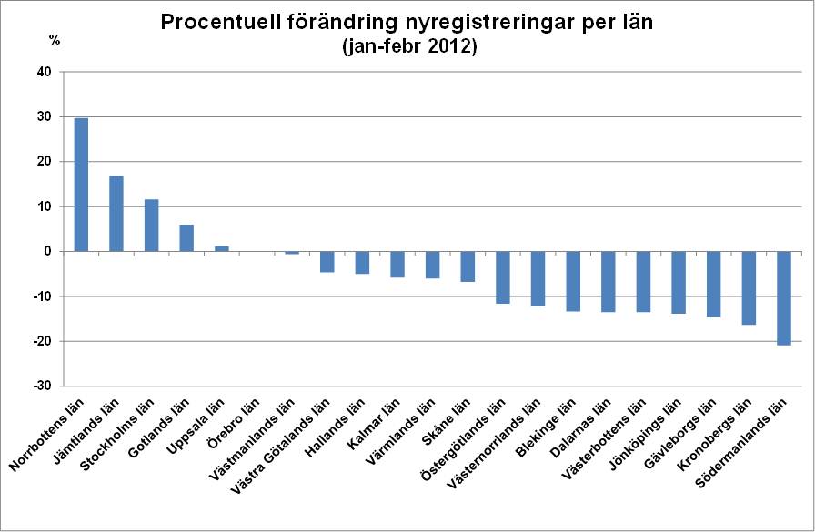 I Stockholms län uppgick det totala antalet nyregistrerade personbilar under jan-febr 2012 till 11 344 vilket är 11,6% fler än under jan-febr 2011. Motsvarande siffror för det näst största länet, Västra Götalands län, var 7 027 registreringar, en nedgång med 4,7 %. Det län som hade den största ökningstakten för nyregistreringarna var Norrbottens län med ett plus på 29,7%, följt av Jämtlands län med en ökning på 16,9% under jan-febr 2012.