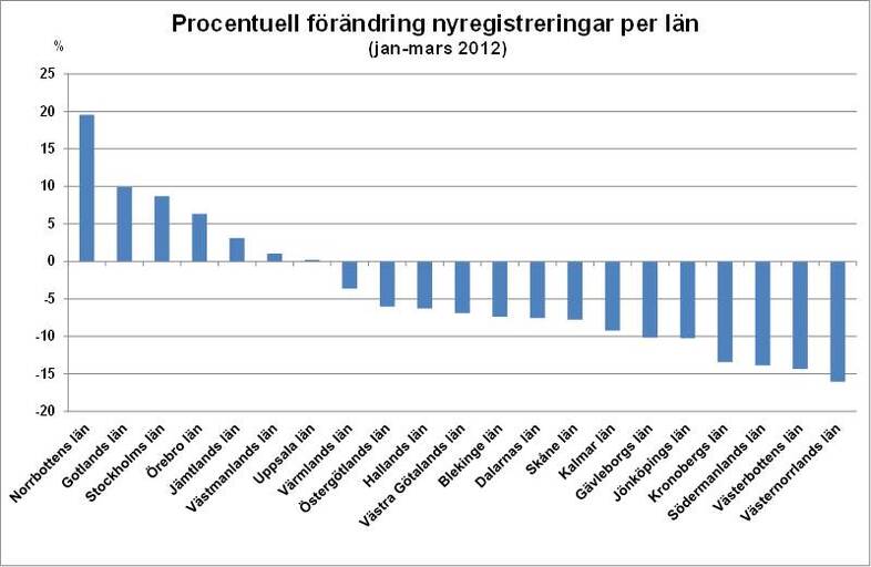 I Stockholms län uppgick det totala antalet nyregistrerade personbilar under jan-mars 2012 till 19 628 vilket är 8,7% fler än under jan-mars 2011. Motsvarande siffror för det näst största länet, Västra Götalands län, var 12 204 registreringar, en nedgång med 6,9 %. Det län som hade den största ökningstakten för nyregistreringarna var Norrbottens län med ett plus på 19,5%, följt av Gotlands län med en ökning på 10,0% under jan-mars 2012.