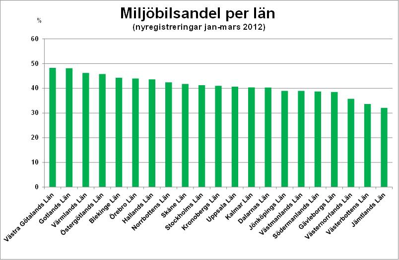 Västra Götalands län hade den högsta miljöbilsandelen i landet under jan-mars 2012 då 48,3% av alla nyregistreringar i länet var miljöbilar. På andra plats kom Gotlands län med 48,2% miljöbilar. Riksgenomsnittet för miljöbilsandelen under jan-mars 2012 var 42,5% jämfört med 35,4% under jan-mars 2011.