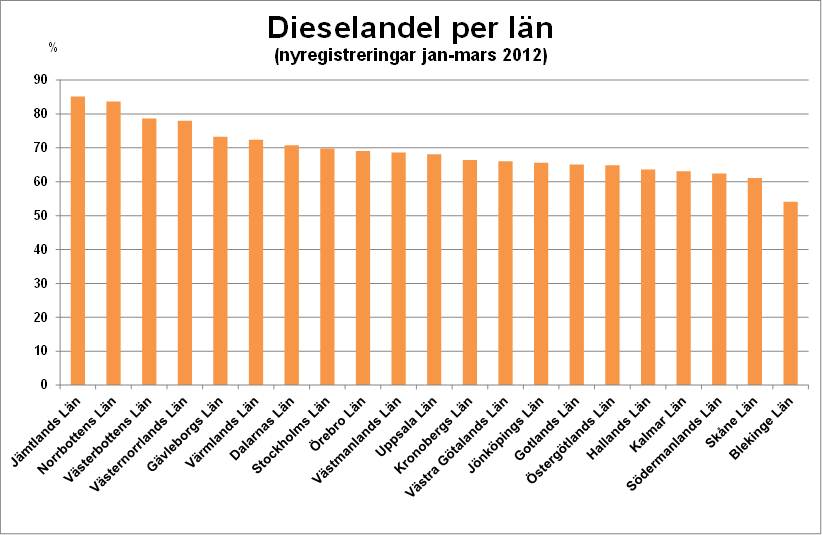 Den högsta dieselandelen under jan-mars 2012 hade Jämtlands län med 85,1% dieslar av de totala nyregistreringarna i länet. Den näst högsta dieselandelen hade Norrbottens län med 83,7%. Riksgenomsnittet för dieselandelen under jan-mars 2012 var 67,7% jämfört med 60,4% under jan-mars 2011.