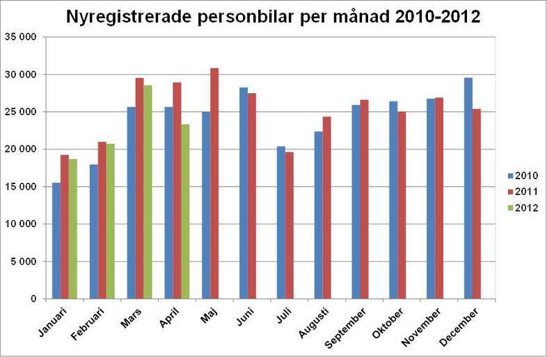 - Fordonsregistreringarna minskade i april jämfört med de mycket starka fjolårssiffrorna. Hittills i år har nyregistreringarna av personbilar och lätta lastbilar minskat med knappt åtta procent, vilket innebär att vi ligger något bättre till än vår prognos för helåret 2012 som är lika med en minskning med 11 procent för både personbilar och lätta lastbilar. Omräknat i årstakt ligger nyregistreringarna under de fyra första månaderna över prognosen för i år på 270 000 personbilar och 41 000 lätta lastbilar, säger Bertil Moldén, vd för BIL Sweden.