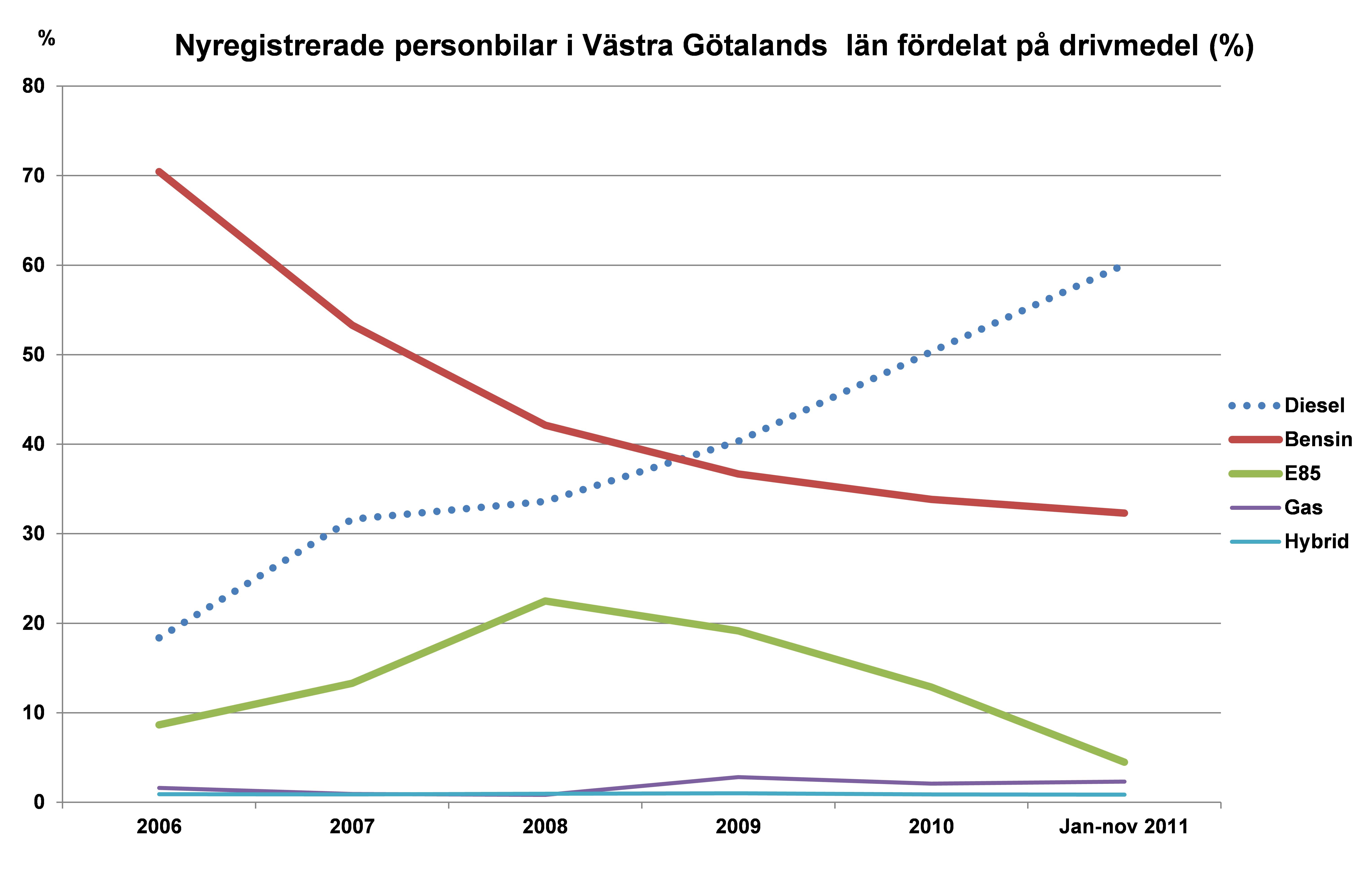 - Omställningen på den svenska nybilsmarknaden har varit dramatisk under de senaste åren där andelen dieselbilar ökat kraftigt samtidigt som andelen bensinbilar sjunkit kraftigt. I exempelvis Västra Götalands län var 18 procent av nybilsregistreringarna dieselbilar och 70 procent bensinbilar under 2006. Hittills i år är 60 procent dieslar och 32 procent bensinare av nybilsregistreringarna i Västra Götaland, säger Bertil Moldén, vd för BIL Sweden.