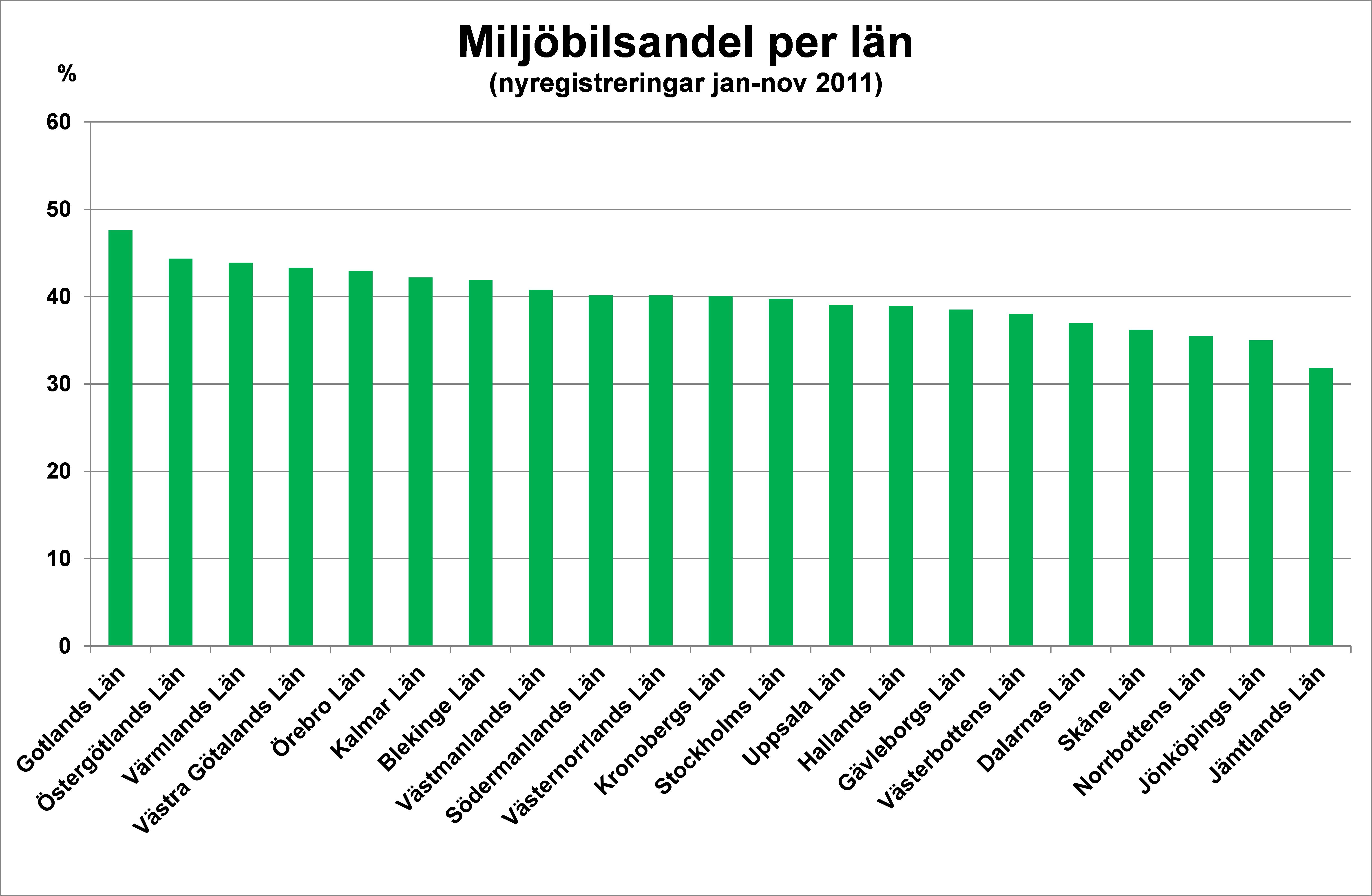 Gotlands län hade den högsta miljöbilsandelen i landet under jan-nov 2011 då 47,6% av alla nyregistreringar i länet var miljöbilar. På andra plats kom Östergötlands län med 44,4% miljöbilar. Riksgenomsnittet för miljöbilsandelen var 40,0% under jan-nov 2011 jämfört med 39,4% under jan-nov 2010.