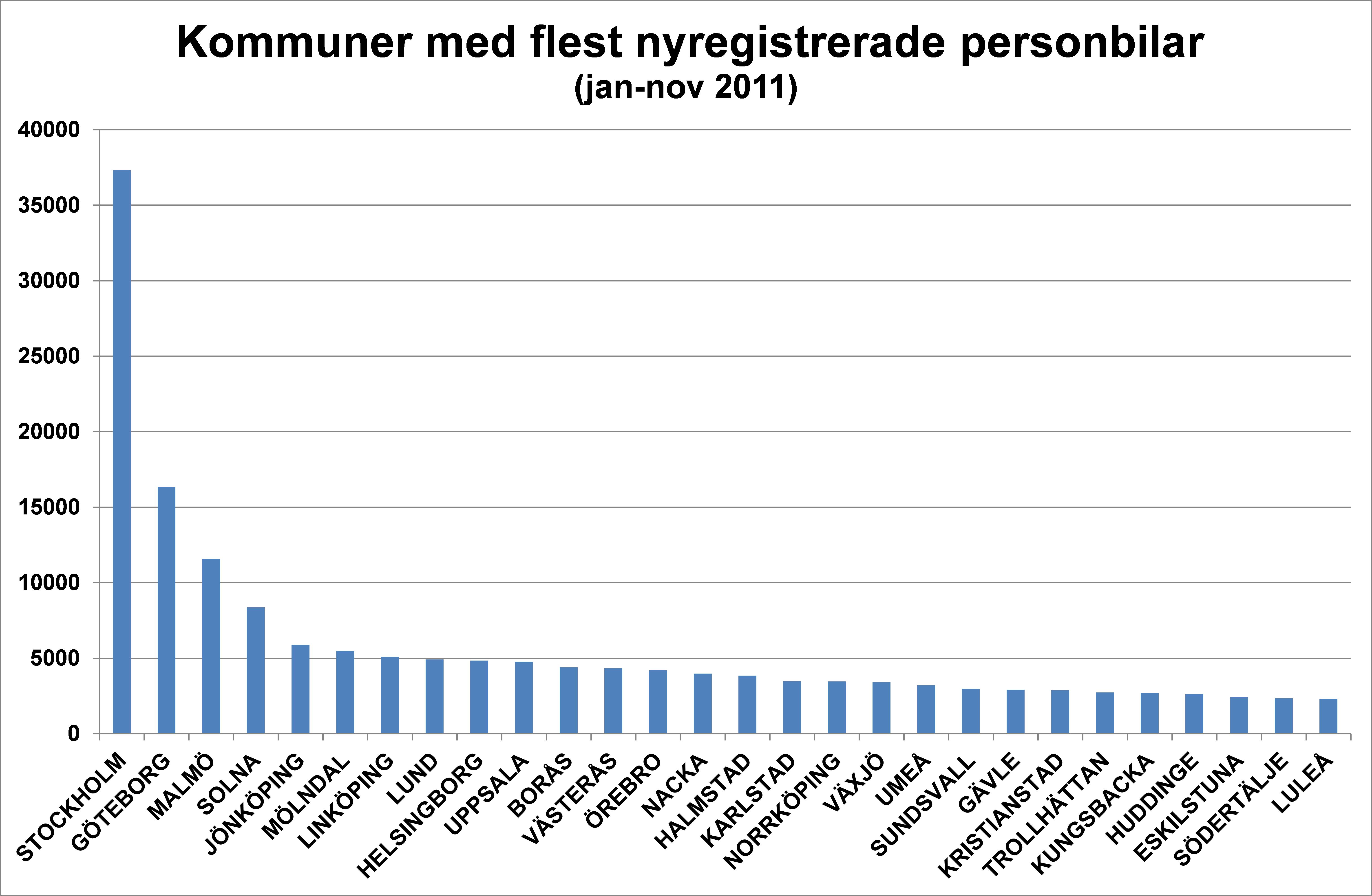 Nyregistreringarna per kommun visar att Stockholm är den kommun i landet som hade flest nyregistreringar under jan-nov 2011 med 37 318 följt av Göteborg med 16 333 registreringar. Sorsele var den kommun som hade minsta antalet registreringar med 11 bilar. De höga registreringarna i Stockholm beror bl.a. annat på att många stora börsbolag har sitt säte i Stockholm och att dessa bilar registreras i Stockholm även om de används i övriga delar av landet. Att Solna har så många registreringar beror på att flera leasing- och hyrbilsbolag har sitt säte i Solna, vilket innebär att många leasingbilar och hyrbilar registreras i Solna men bilarna används i övriga delar av landet.
