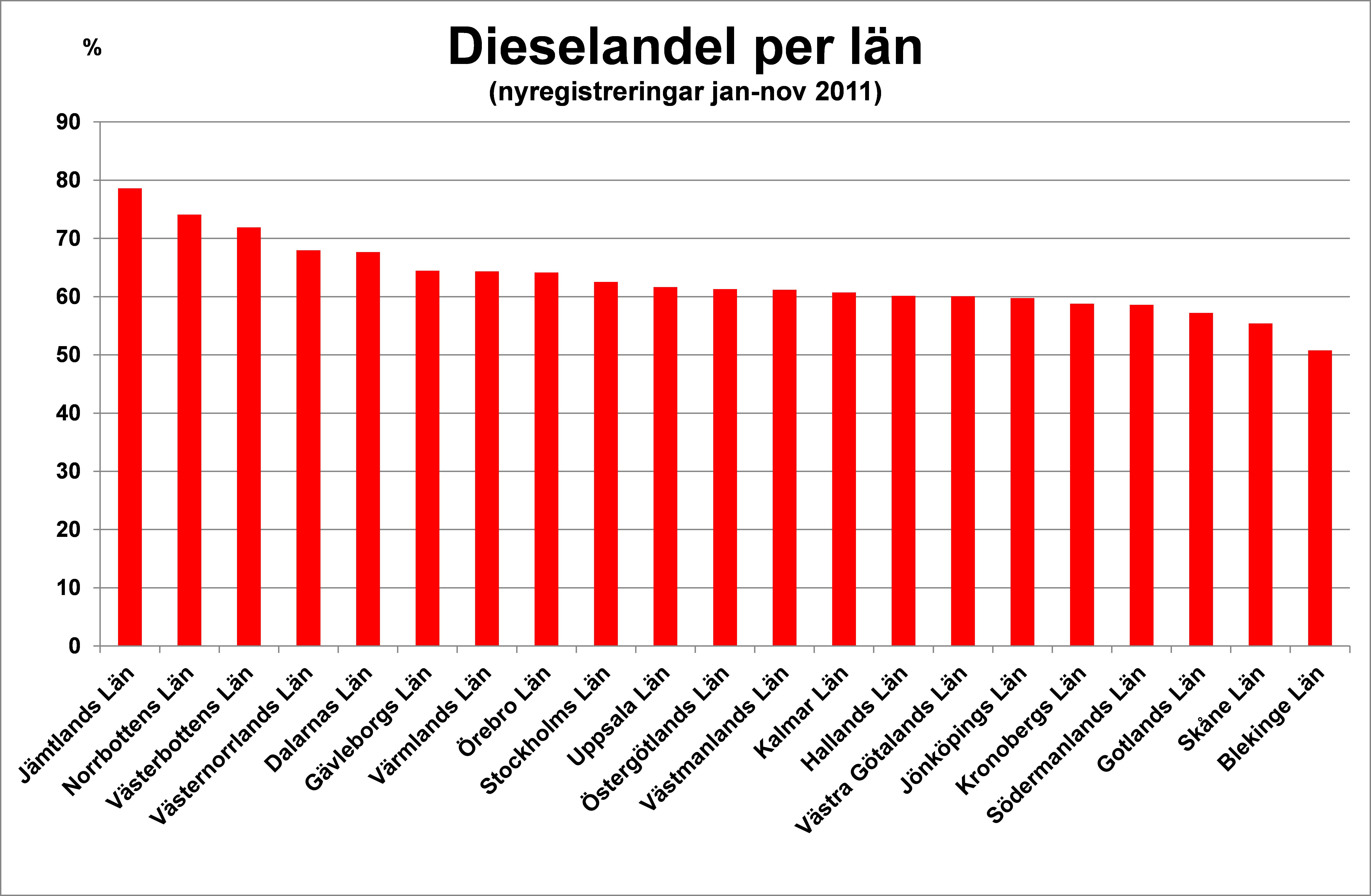 Den högsta dieselandelen under jan-nov 2011 hade Jämtlands län med 78,6% dieslar av de totala nyregistreringarna i länet. Den näst högsta dieselandelen hade Norrbottens län 74,1%. Riksgenomsnittet för dieselandelen under jan-nov 2011 var 61,3% jämfört med 50,3% under jan-nov 2010.