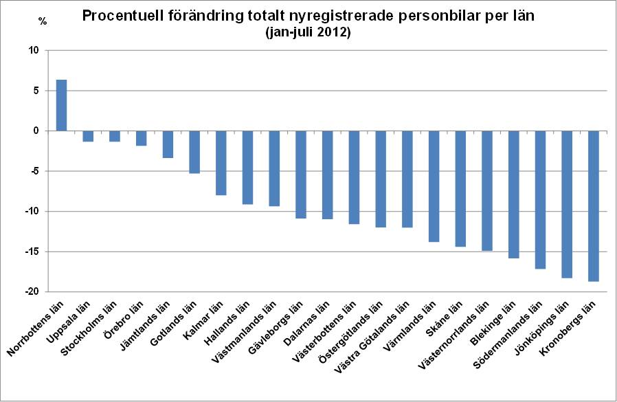 I Stockholms län uppgick det totala antalet nyregistrerade personbilar under jan-juli 2012 till 45 228 vilket är 1,4 % färre än under jan-juli 2011. Motsvarande siffror för det näst största länet, Västra Götalands län, var 29 177 registreringar, en nedgång med 12,0 %. Det enda län som ökade sina registreringar var Norrbottens län med ett plus på 6,4 %.