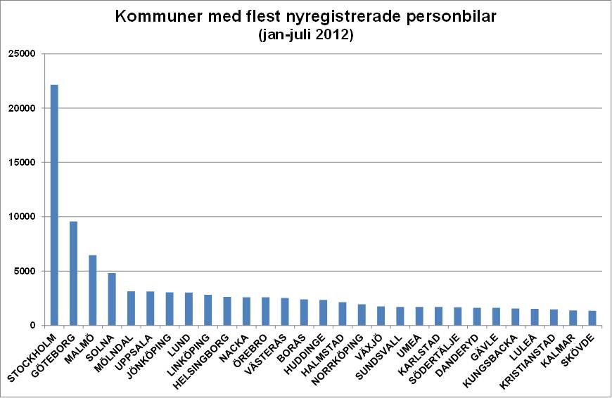 Nyregistreringarna per kommun visar att Stockholm är den kommun i landet som hade flest nyregistreringar under jan-juli 2012 med 22 150 följt av Göteborg med 9 566 registreringar. De höga registreringarna i Stockholm beror bl.a. annat på att många stora börsbolag har sitt säte i Stockholm och att dessa bilar registreras i Stockholm även om de används i övriga delar av landet. Att Solna har så många registreringar beror på att flera leasing- och hyrbilsbolag har sitt säte i Solna, vilket innebär att många leasingbilar och hyrbilar registreras i Solna men bilarna används i övriga delar av landet.