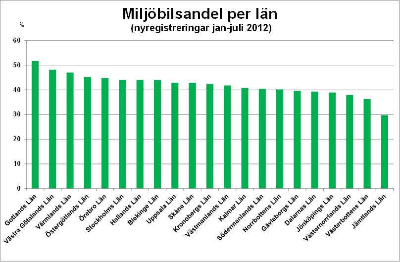 Gotlands län hade den högsta miljöbilsandelen i landet under jan-juli 2012 då 51,7 % av alla nyregistreringar i länet var miljöbilar. På andra plats kom Västra Götalands län med 48,1 % miljöbilar. Riksgenomsnittet för miljöbilsandelen under jan-juli 2012 var 43,6% jämfört med 37,8 % under jan-juli 2011.
