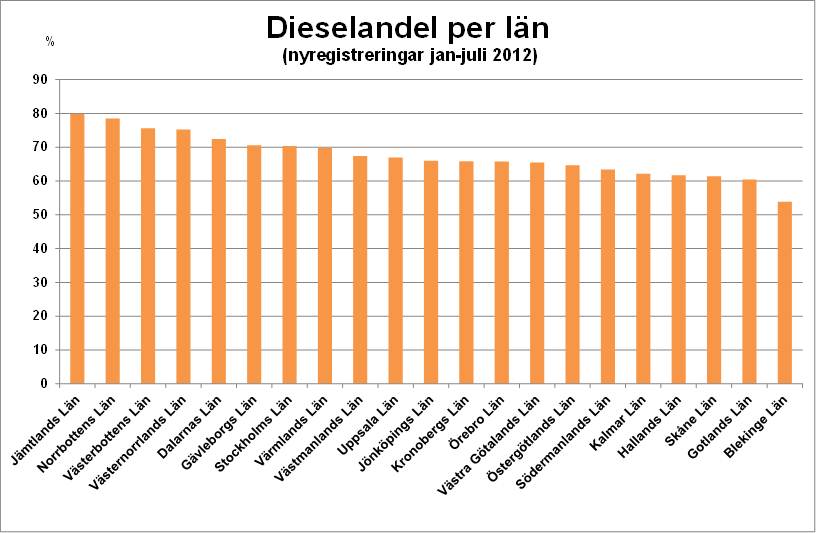 Den högsta dieselandelen under jan-juli 2012 hade Jämtlands län med 79,9 % dieslar av de totala nyregistreringarna i länet. Den näst högsta dieselandelen hade Norrbottens län med 78,6 %. Riksgenomsnittet för dieselandelen under jan-juli 2012 var 67,1 % jämfört med 60,9 % under jan-juli 2011.