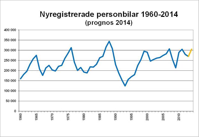 - Om prognosen på 305 000 nya bilar i år slår in blir 2014 det sjätte bästa året genom tiderna. Även om antalet nya bilar ökar över tid, så är 305 000 en mycket stark siffra. Genomsnittet för de senaste tio årens nybilsregistreringar ligger på 274 000 bilar per år, avslutar Bertil Moldén.