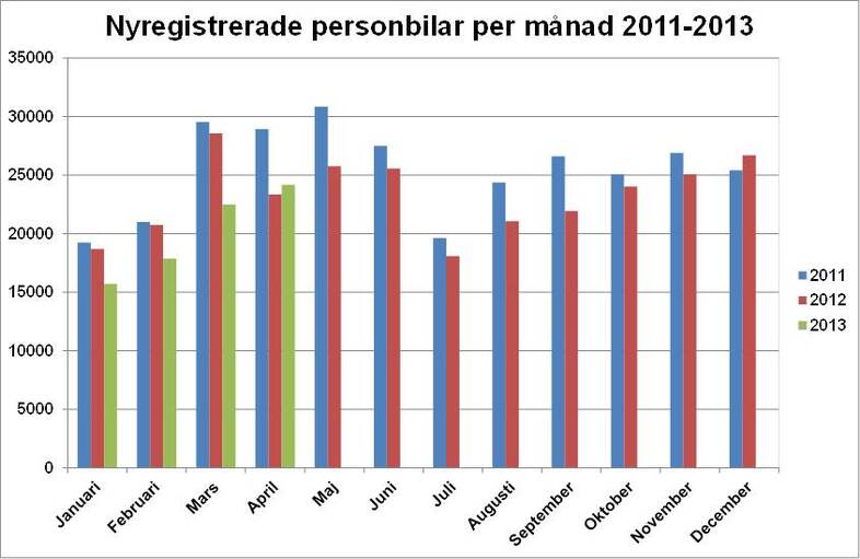 Under april registrerades 24 175 nya personbilar, vilket är en ökning med 3,6 % jämfört med samma månad förra året. Hittills i år, januari-april, har registreringarna minskat med 12,1%. Lastbils-registreringarna totalt minskade med 14,6% under april till 3 616. Hittills i år har lastbilsregistreringarna minskat med 10,9 %. Lätta lastbilar upp till 3,5 ton minskade i april med 12,7% och tunga lastbilar över 16 ton minskade med 27,8 %. Hittills i år har lätta lastbilar minskat med 8,7 % och tunga lastbilar har minskat med 27,4 %.
