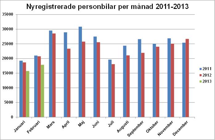 Under februari registrerades 17 860 nya personbilar, vilket är en minskning med 13,9 % jämfört med samma månad förra året. Hittills i år, januari-februari, har registreringarna minskat med 14,8 %. Lastbilsregistreringarna totalt minskade med 6,8% under februari till 3 120. Hittills i år har lastbils-registreringarna minskat med 5,8 %. Lätta lastbilar upp till 3,5 ton minskade i februari med 4,1% och tunga lastbilar över 16 ton minskade med 27,3 %. Hittills i år har lätta lastbilar minskat med 3,6 % och tunga lastbilar har minskat med 21,6 %.