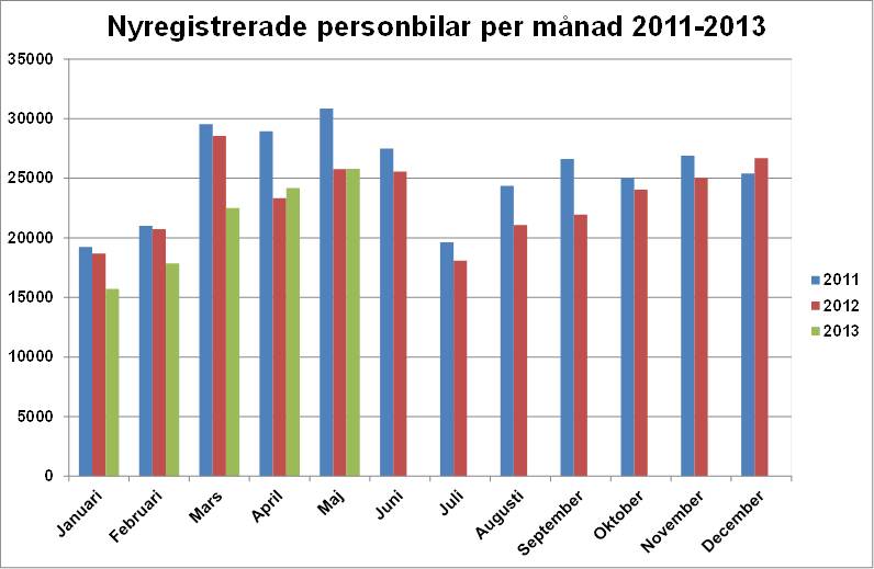 Under maj registrerades 25 782 nya personbilar, vilket är en ökning med 0,1 % jämfört med samma månad förra året. Hittills i år, januari-maj, har registreringarna minskat med 9,4%. Lastbils-registreringarna totalt minskade med 13,9% under maj till 3 652. Hittills i år har lastbilsregistreringarna minskat med 11,6 %. Lätta lastbilar upp till 3,5 ton minskade i maj med 14,1% och tunga lastbilar över 16 ton minskade med 8,8 %. Hittills i år har lätta lastbilar minskat med 9,9 % och tunga lastbilar har minskat med 23,5 %.