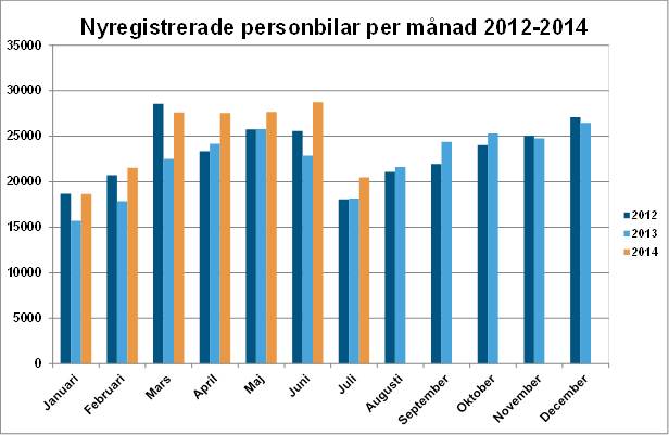 Under juli registrerades 20 473 nya personbilar, vilket är en ökning med 12,7 % jämfört med samma månad förra året. Hittills i år, januari-juli har registreringarna ökat med 17,1 %. Lastbilsregistreringarna totalt ökade med 3,2 % under juli till 2 495. Hittills i år har lastbilsregistreringarna ökat med 12,7%. Lätta lastbilar upp till 3,5 ton ökade i juli med 7,5 % och tunga lastbilar över 16 ton minskade med 27,2 %. Hittills i år har lätta lastbilar ökat med 12,5 % och tunga lastbilar har ökat med 16,9 %.