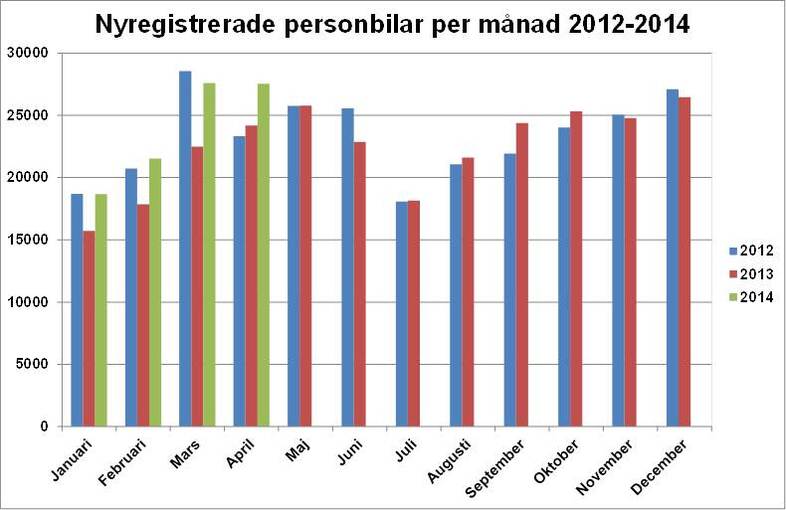 Under april registrerades 27 543 nya personbilar, vilket är en ökning med 13,9 % jämfört med samma månad förra året. Hittills i år, januari-april har registreringarna ökat med 18,8 %. Lastbilsregistreringarna totalt ökade med 12,9 % under april till 4 084. Hittills i år har lastbilsregistreringarna ökat med 13,9%. Lätta lastbilar upp till 3,5 ton ökade i april med 10,6 % och tunga lastbilar över 16 ton ökade med 41,0 %. Hittills i år har lätta lastbilar ökat med 12,7 % och tunga lastbilar har ökat med 26,0 %.