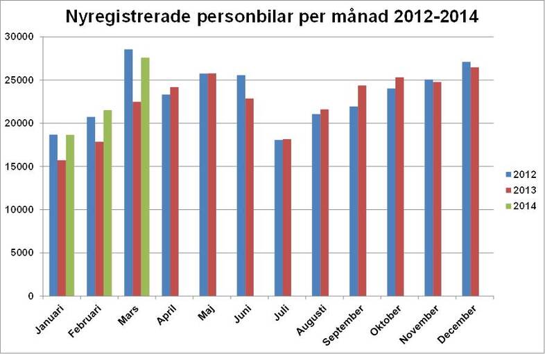 Under mars registrerades 27 605 nya personbilar, vilket är en ökning med 22,7 % jämfört med samma månad förra året. Hittills i år, januari-mars har registreringarna ökat med 20,9 %. Lastbilsregistreringarna totalt ökade med 19,6 % under mars till 4 503. Hittills i år har lastbilsregistreringarna ökat med 14,2%. Lätta lastbilar upp till 3,5 ton ökade i mars med 18,5% och tunga lastbilar över 16 ton ökade med 34,0 %. Hittills i år har lätta lastbilar ökat med 13,4 % och tunga lastbilar har ökat med 20,6 %.