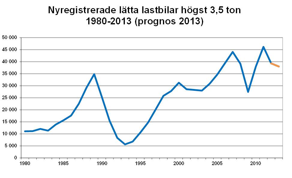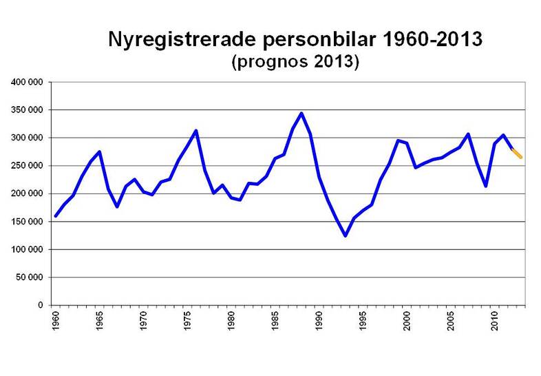 • BIL Swedens prognos för 2013 om 265 000 nya personbilar och 38 000 lätta lastbilar ligger fast. Under 2012 nyregistrerades 280 000 personbilar och 39 000 lätta lastbilar.