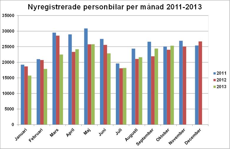 - Den positiva trenden på bilmarknaden fortsatte i oktober då bilregistreringarna ökade med 5,4%, vilket är fjärde månaden i rad med plussiffror, helt i linje med vår prognos för kalenderåret 2013. Bilregistreringarna är en viktig konjunkturindikator och de ökade registreringarna under de senaste månaderna visar att den svenska ekonomin är på väg att återhämta sig, säger Bertil Moldén, vd för BIL Sweden.
