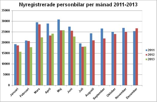 - Nybilsmarknaden har hittills i år utvecklats enligt våra förväntningar. Minskningen under det första kvartalet var väntad mot bakgrund av miljöbilsruschen i slutet på förra året som berodde på ändrade miljöbilsregler och som sedan ledde till en motsvarande nedgång under de första månaderna i år. Därefter har det skett en stabilisering under perioden april-juli i enlighet med vår prognos, säger Bertil Moldén.