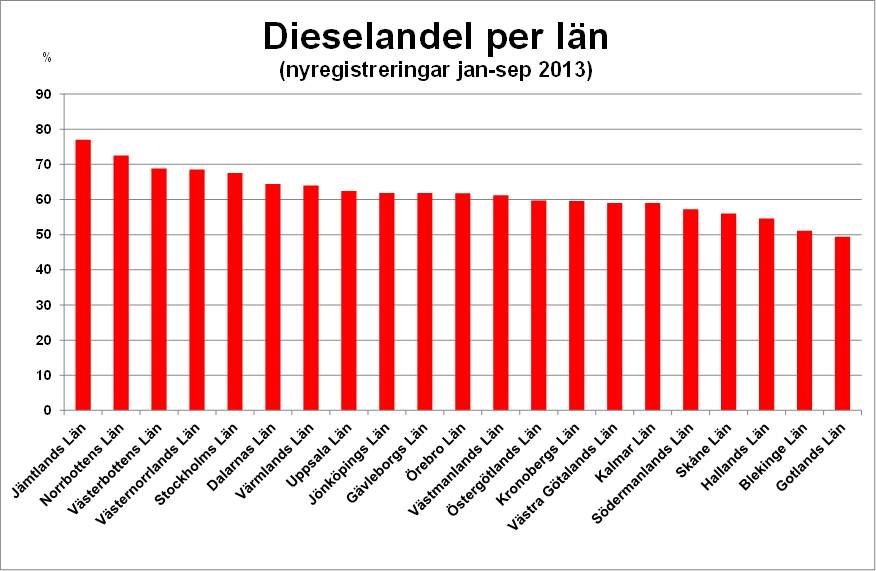 - Andelen dieslar av nya bilar i riket som helhet har minskat från rekordnivån 67 procent jan-sep förra året till drygt 62 procent samma period i år. Dieselandelen ligger dock fortfarande på historiskt sett höga nivåer, även om trenden mot ökad dieselandel har mattats av. År 2005 var dieselandelen i Sverige bara tio procent, och sedan dess har det skett en europaanpassning av den svenska dieselandelen, avslutar Bertil Moldén.