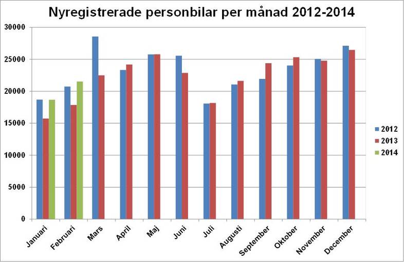 - Nybilsregistreringarna ökade med drygt 20 procent i februari, vilket är andra månaden i rad med en kraftig uppgång. Det är helt enligt förväntningarna och vår prognos att vi skulle få stora plussiffror i början på året beroende på att vi jämför med svaga registreringar motsvarande period förra året. Orsaken till de svaga siffrorna under det första kvartalet ifjol är tidigareläggningen av miljöbilsregistreringar i slutet på 2012, vilket i sin tur medförde färre registreringar under inledningen av 2013, säger Bertil Moldén, vd för BIL Sweden.