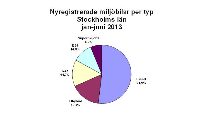 - Den vanligaste miljöbilen är en dieselbil. Både i Stockholms län och i riket som helhet är varannan nyregistrerad miljöbil hittills i år en dieselbil. Det är en lägre andel jämfört med den gamla miljöbilsdefinitionen som gällde till och med 2012 då två av tre nya miljöbilar var dieslar, avslutar Bertil Moldén.